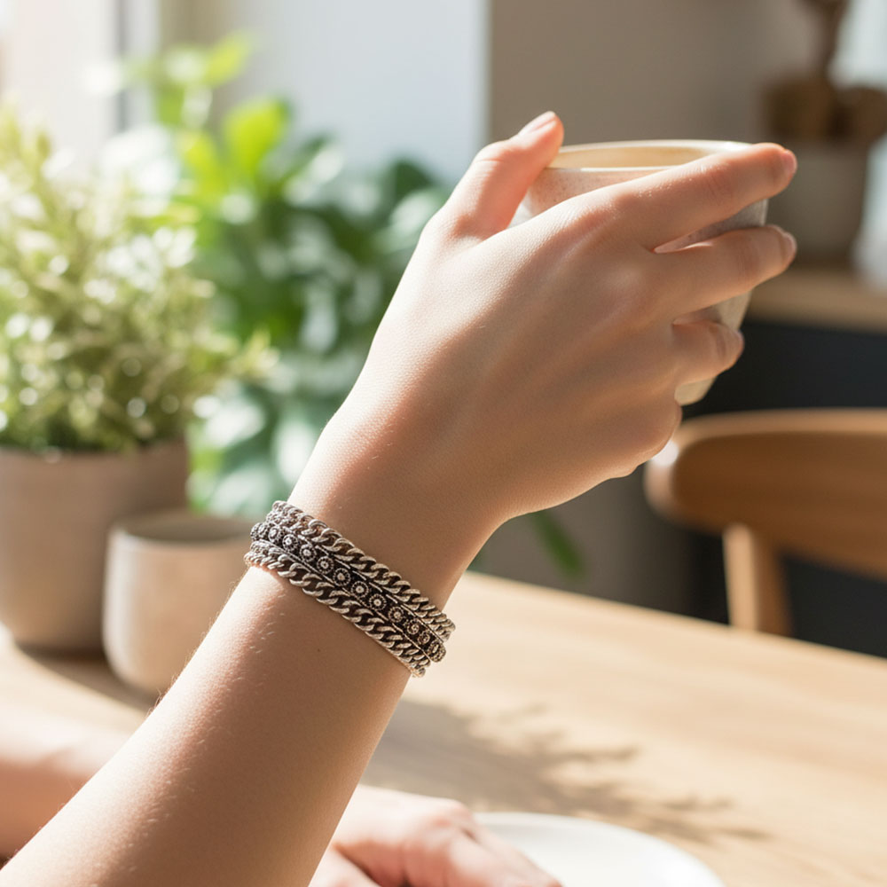 SG Imports Victorian oxidized silver look a like designer bracelet made of brass with oxidized silver platted The bracelets are durable and reliable for long-time use! We have specially designed for superb styling. It makes a good gift for your loved one. This bracelet can be used for daily wear as well as for party wear. It creates a definite and interesting curvaceous form that adds glamor to the wearer. They represent the wisdom of the ancient ones and are highly respected for their strength and individuality. SG Imports is an online retail store with high-quality jewelry and accessories with strikingly exquisite designs. With its affordable rates and unique shopping experience, SG Imports is your one-stop destination for making any given day an occasion.